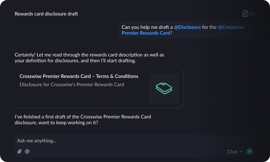 * Co-author Documents & Reports. You can chat with Crosswise and mention things like "I need a new Regulation E Policy" and Crosswise will walk you through the applicability analysis and then co-author the document according to your policy template.